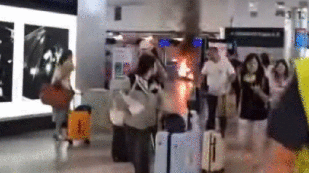 The incident began around 11:00 a.m. local time, when the suspect approached a check-in counter in Terminal 1. According to eyewitness reports, he was armed with a hammer and what appeared to be a flammable liquid. Without warning, he doused the counter and ignited it, causing flames to erupt rapidly. The fire quickly spread, engulfing the immediate area and producing thick, black smoke that filled the terminal.