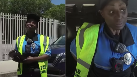 The video in question begins with what appears to be an ordinary encounter between a parking enforcement officer and a police vehicle parked illegally. The uniformed woman approaches the car, checks the surroundings, and then places a ticket on the windshield.