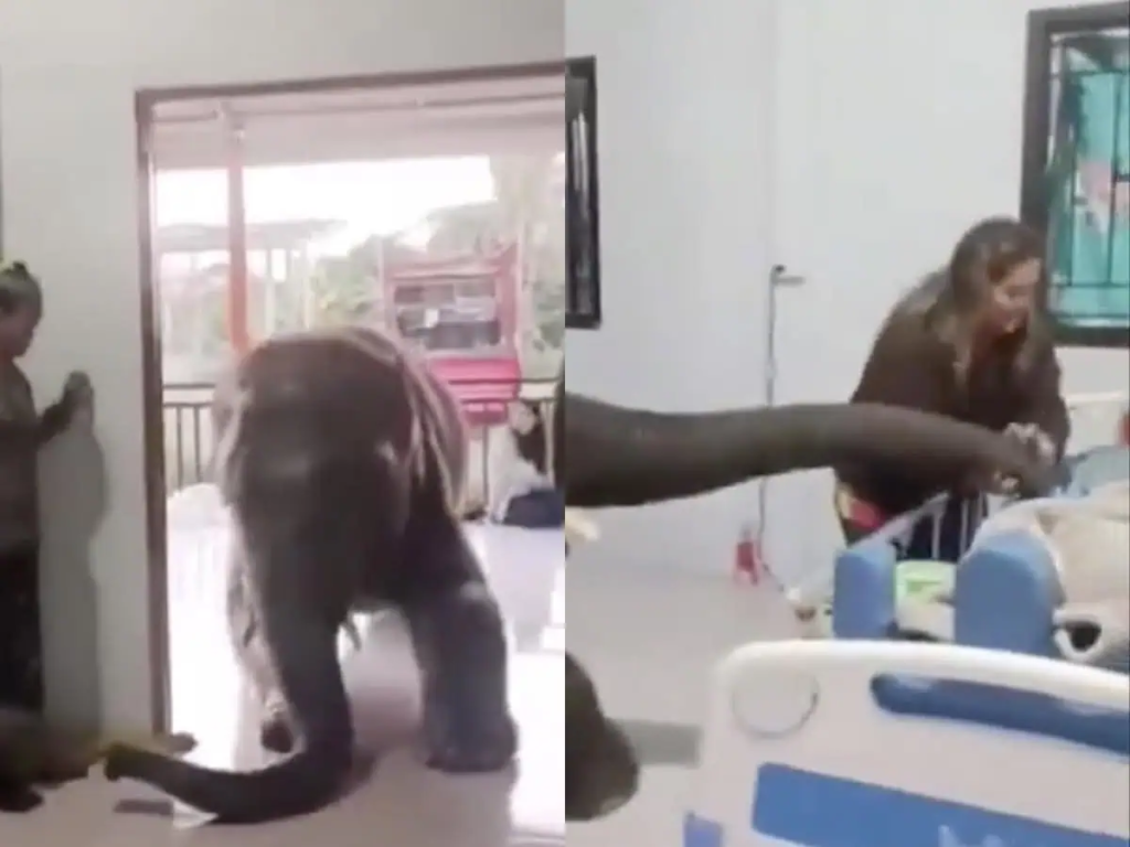 The touching video begins with the animal standing at the entrance of a hospital room, cautiously stepping inside as it approaches its beloved caretaker. The elderly man, lying weakly on the bed, is gently assisted by a woman—possibly a nurse or relative—to reach out and touch the elephant’s trunk.