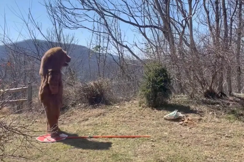 The video shows the man emerging in a brown bear costume, carefully approaching the black bear with exaggerated movements, mimicking the behavior of an actual bear. He even lets out a few growls to reinforce the illusion. Surprisingly, the real black bear, which had been seen on the property multiple times, appears visibly startled by the encounter.
