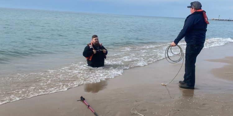 Help arrived in the form of four firefighters from the Leland Township Fire and Rescue team. They approached cautiously, mindful of the soft terrain that had ensnared Mitchell.