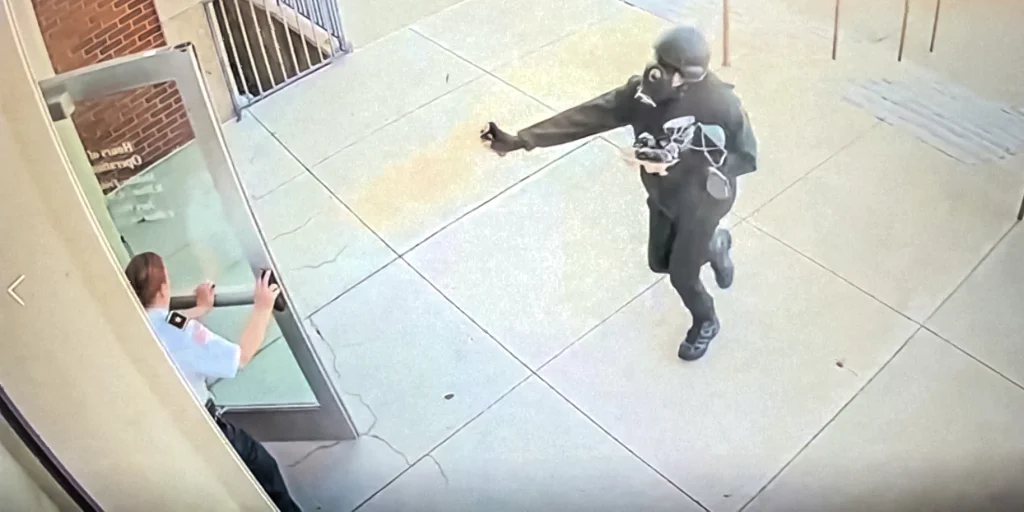As he approached the courthouse entrance, a female court officer attempted to block his entry by holding the door shut, but Akerberg forced his way inside, deploying pepper spray.