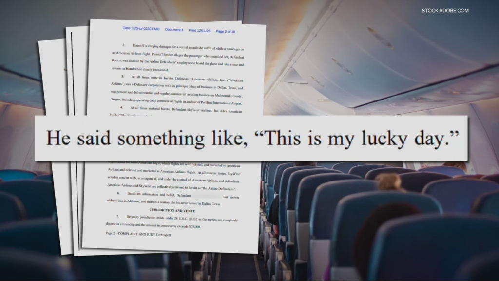An Oregon woman has filed a negligence lawsuit against American Airlines, SkyWest Airlines, and an individual passenger, alleging that failures in airline safety protocols led to her being sexually assaulted during a commercial flight. The incident is said to have occurred on December 10, 2024, during a flight from Missouri to Portland, Oregon, with a stopover in Dallas. According to the lawsuit, the woman was assaulted during the plane’s takeoff by a man she says was visibly intoxicated and should never have been allowed to board the aircraft.