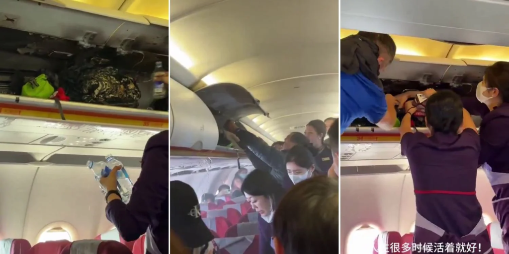 Terrified passengers and flight attendants douse burning power bank on plane mid-flight. pic.twitter.com/sLm1ldBANV