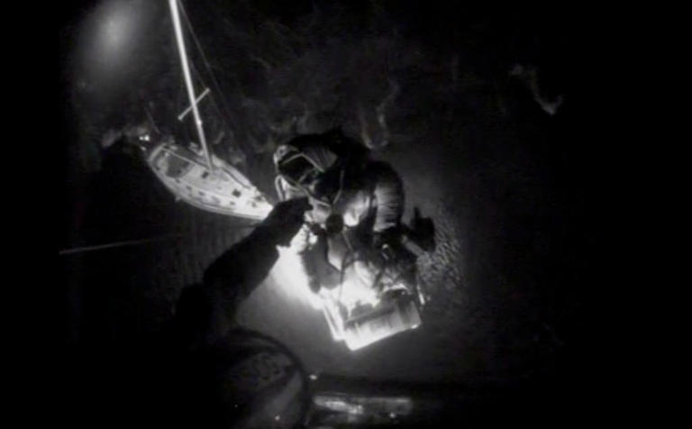 During the operation involving the Chusan, the helicopter crew maneuvered into position above the grounded sailboat and prepared for extraction. The hoisting process involves lowering a rescue device, typically a harness or basket, to the vessel below. Occupants must be secured carefully before being lifted upward through powerful downdrafts generated by the helicopter’s rotors. These conditions can be disorienting, particularly for individuals unfamiliar with aerial rescue procedures.