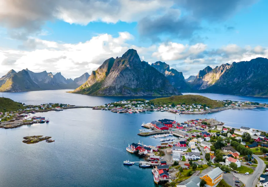The Lofoten Islands are a collection of stunning fishing villages known for their dramatic landscapes, picturesque beaches, and vibrant culture. Villages like Reine and Henningsvær offer breathtaking views of the surrounding mountains and fjords, making them some of the most photographed locations in Norway.