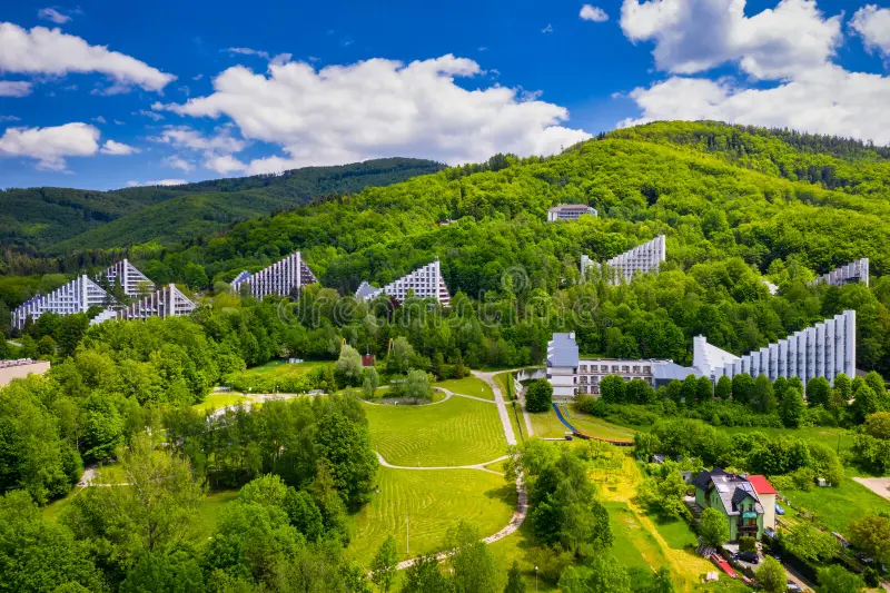 Ustroń is a lovely health resort village located in the Silesian Beskids, known for its stunning mountain scenery and wellness opportunities. The village features charming wooden houses, beautiful parks, and a welcoming atmosphere.