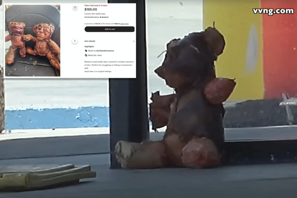 The events unfolded on Sunday, July 13, when concerned residents near the AMPM store on Bear Valley Road in Victorville spotted an object that appeared alarmingly lifelike. Positioned just outside the entrance of the gas station, the teddy bear — which had all the appearances of being stitched together from human skin — alarmed bystanders.