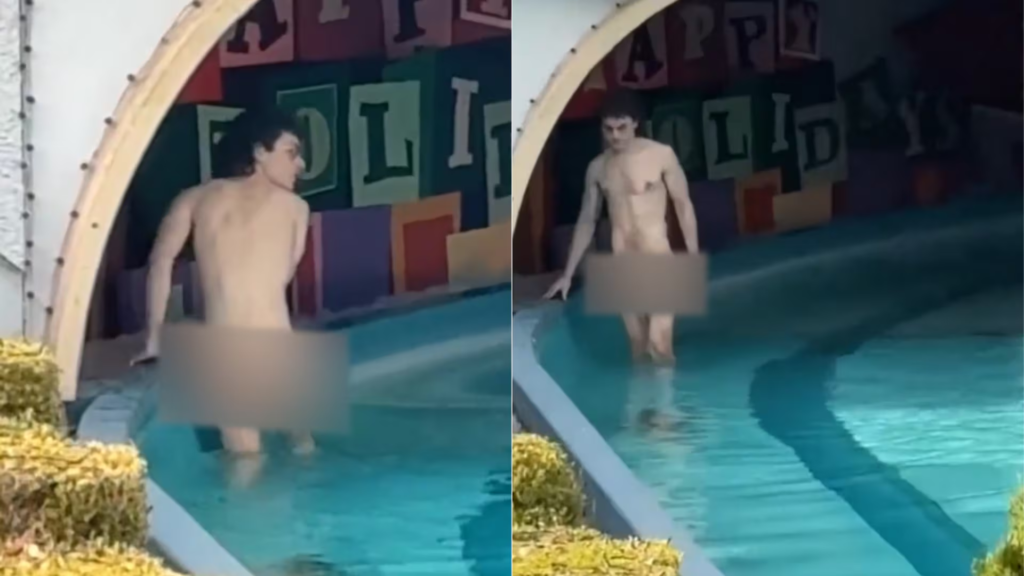 Video footage shared on Instagram and other platforms shows the man standing on the building’s balcony, gesturing toward the crowd, and clambering across the canopy, exposing himself to parkgoers below.